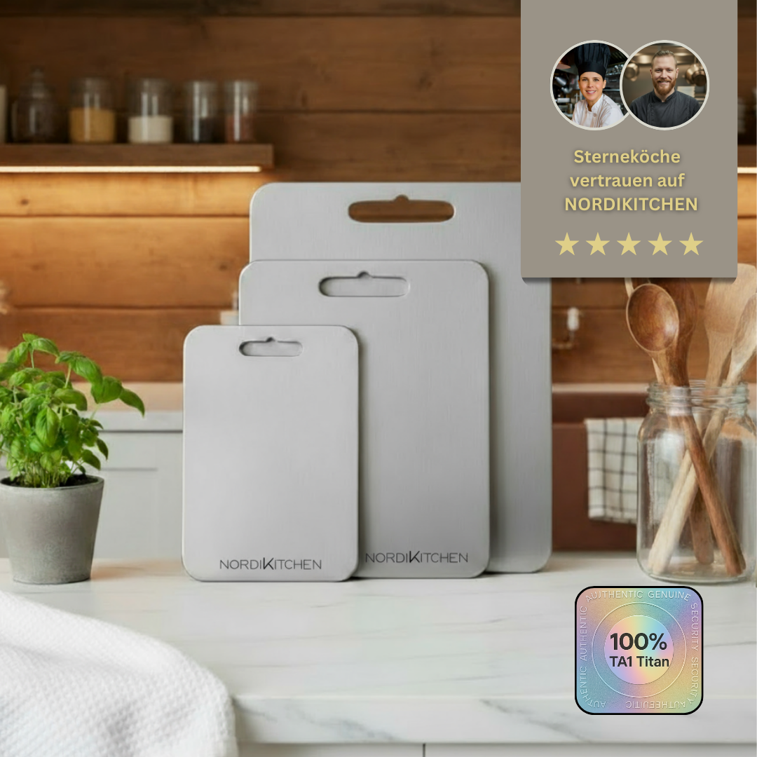 Nordi Titan Pure wird aus hochwertigem Titan gefertigt – hygienisch, geruchsneutral und messerschonend entwickelt. Anders als Holz, Plastik oder Glas nimmt es keine Gerüche auf, reduziert Bakterienansiedlung und benötigt kaum Pflege.