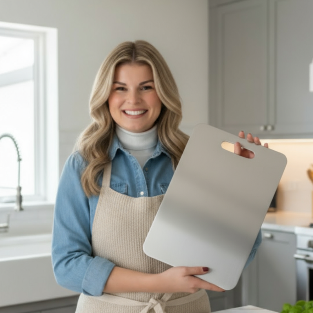 Messer nutzen sich mit der Zeit immer ab – ganz egal, welches Schneidebrett man verwendet. Unser Titan Brett schont deine Klingen deutlich mehr, als viele denken. Der Grund: Messerstahl ist in 99 % der Fälle härter als der Stahl unseres Schneidebretts. Dadurch bleibt die Schärfe lange erhalten.