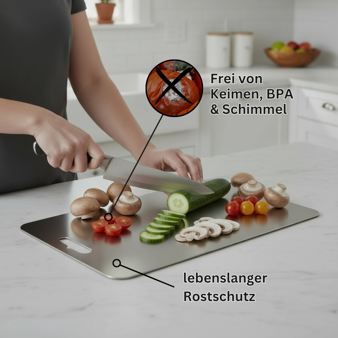 Wenn du in ein echtes Titan-Schneidebrett investierst, bekommst du all diese Vorteile – eine langlebige, verlässliche Lösung mit starkem Preis-Leistungs-Verhältnis für deine Küche.