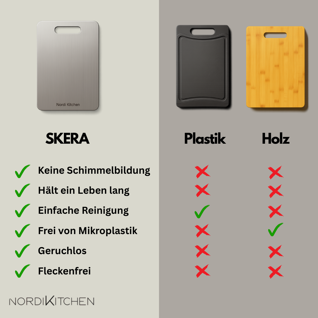 Das Titanbrett SKERA wird aus hochwertigem Titan gefertigt – hygienisch, geruchsneutral und messerschonend entwickelt. Anders als Holz, Plastik oder Glas nimmt es keine Gerüche auf, reduziert Bakterienansiedlung und benötigt kaum Pflege.