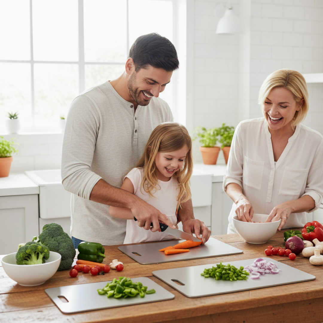 Das Titan-Schneidebrett SKERA ist die saubere Wahl für Familien: porenfrei, antibakteriell und geruchsneutral – ganz ohne Mikroplastik.